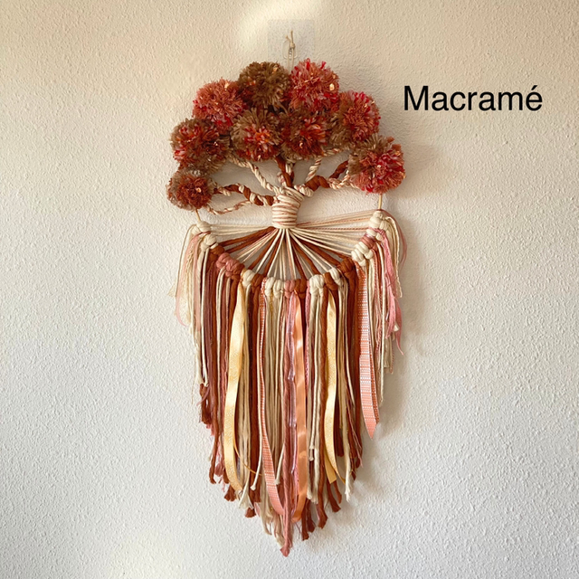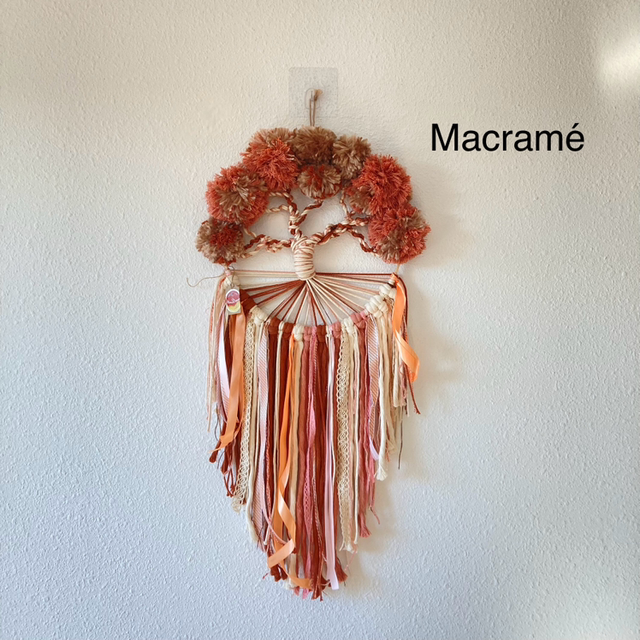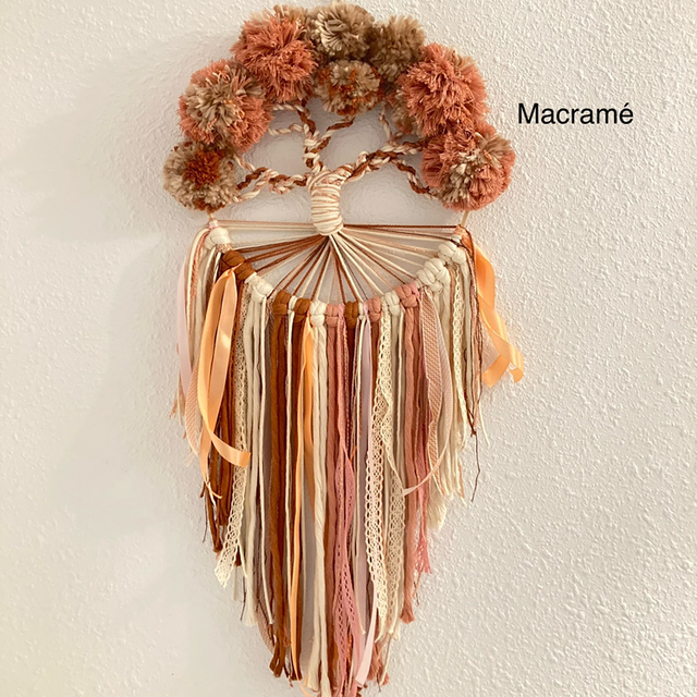 Mélange de vieux rose, de terracotta, de gris chaud, une pointe d’abricot le tout en macramé ou laine a votre préférence. Il y a aussi des rubans, de la dentelle et de la laine pour le mélange des textures, il est parfait pour une chambre.